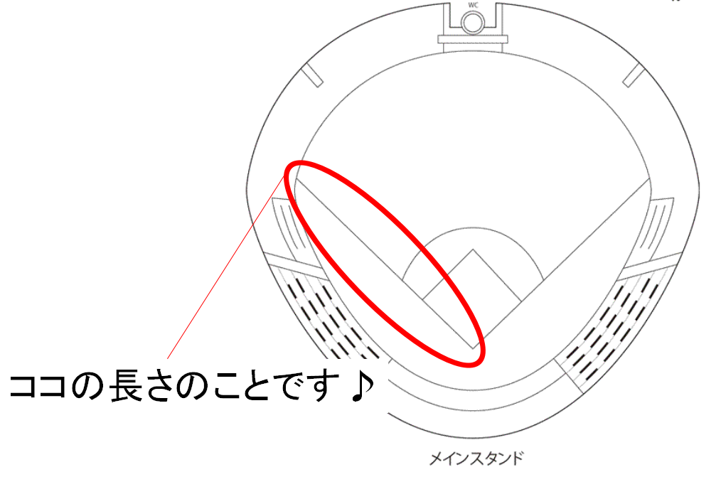 ちなみに両翼というのは、ホームベースから一塁・三塁を通って外野の端までを結んだ距離のことです。