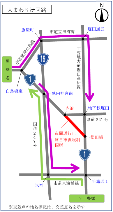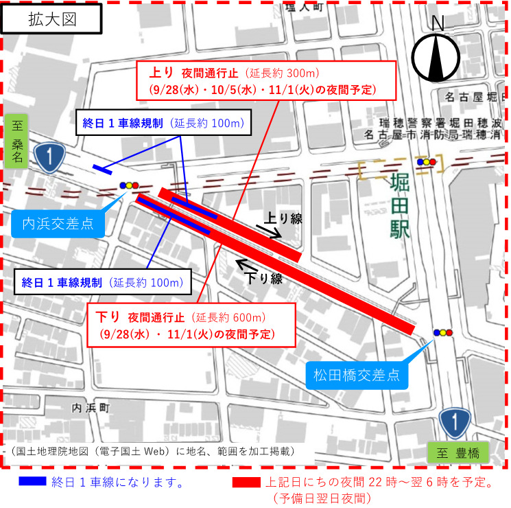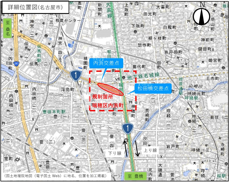 2022年8月17日(水)~2022年12月23日(金)まで、名古屋市瑞穂区の松田橋交差点~内浜交差点間で工事に伴う、終日車線規制があるようです。