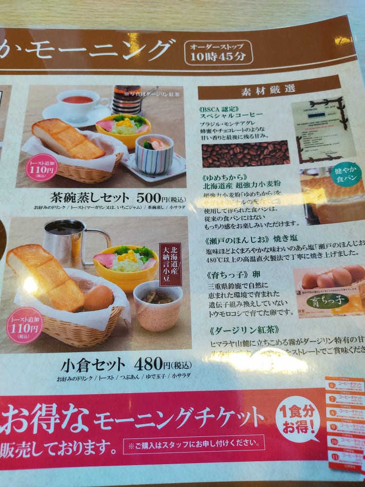 基本的な「モーニングセット」・和食のお店らしい「茶椀蒸しセット」・東海地方のお店らしい「小倉セット」の中からモーニングは選べます。