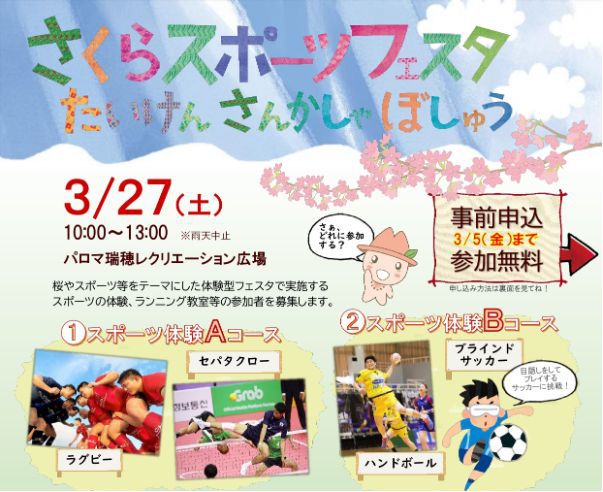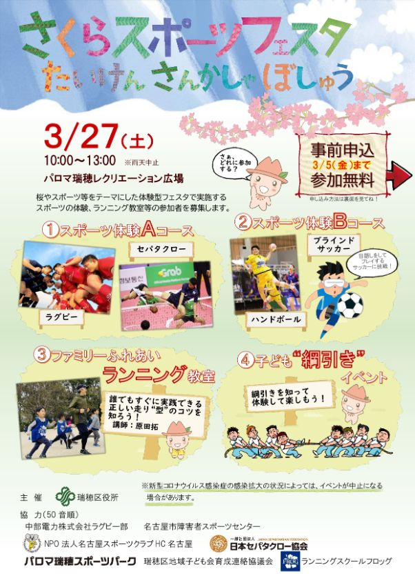 2021年3月27日(土)にパロマ瑞穂レクリエーション広場で、様々なスポーツやランニング教室、そして綱引き!!の体験ができる『さくらスポーツフェスタ』が開催されます!!