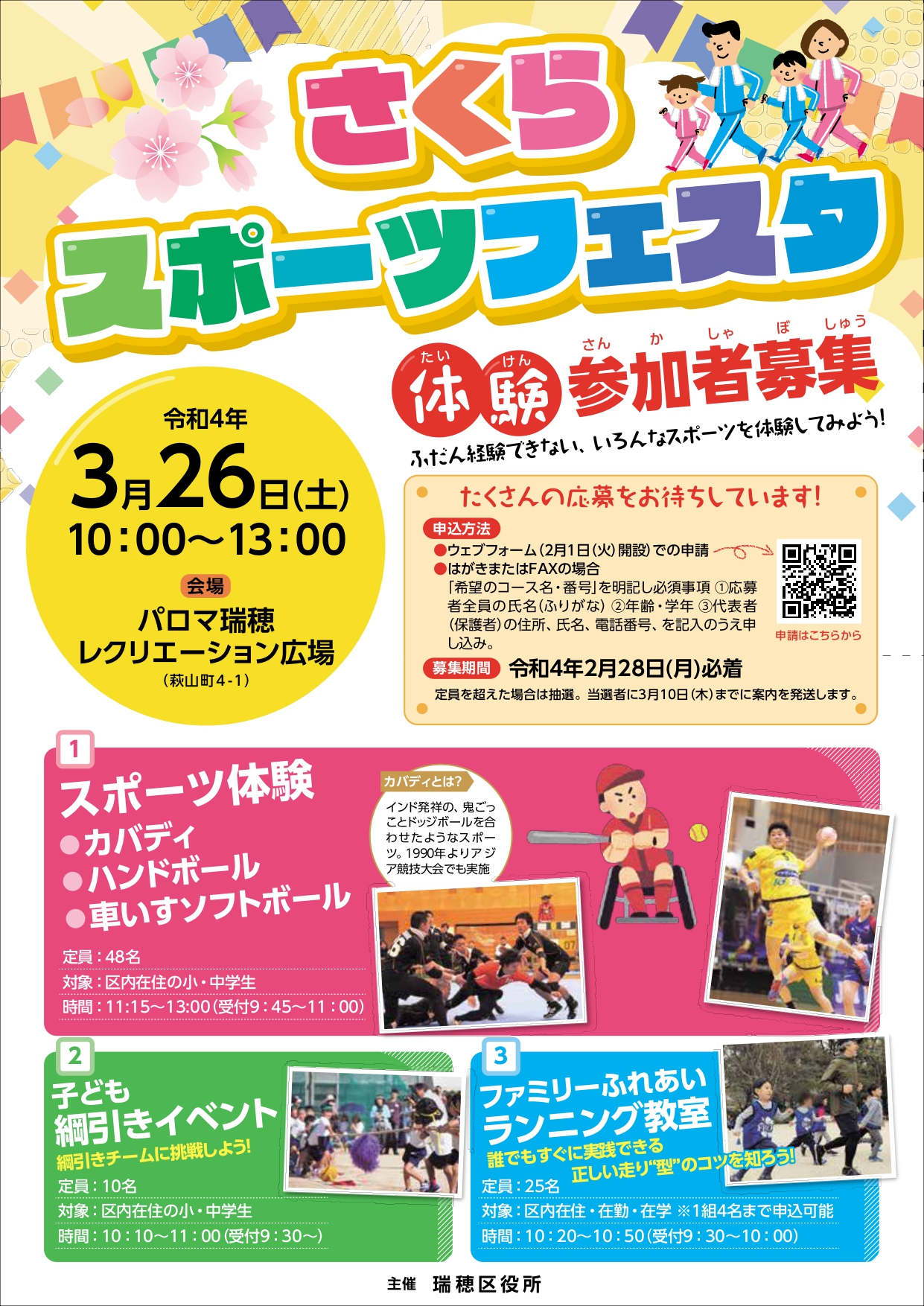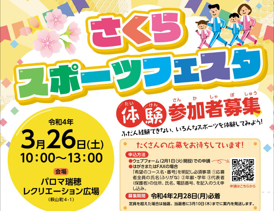 2022年3月26日(土)パロマ瑞穂レクリエーション広場で、子ども綱引きや様々なスポーツ体験が出来る『さくらスポーツフェスタ』が開催されます。