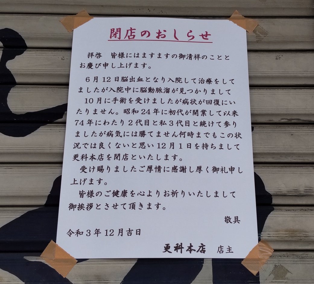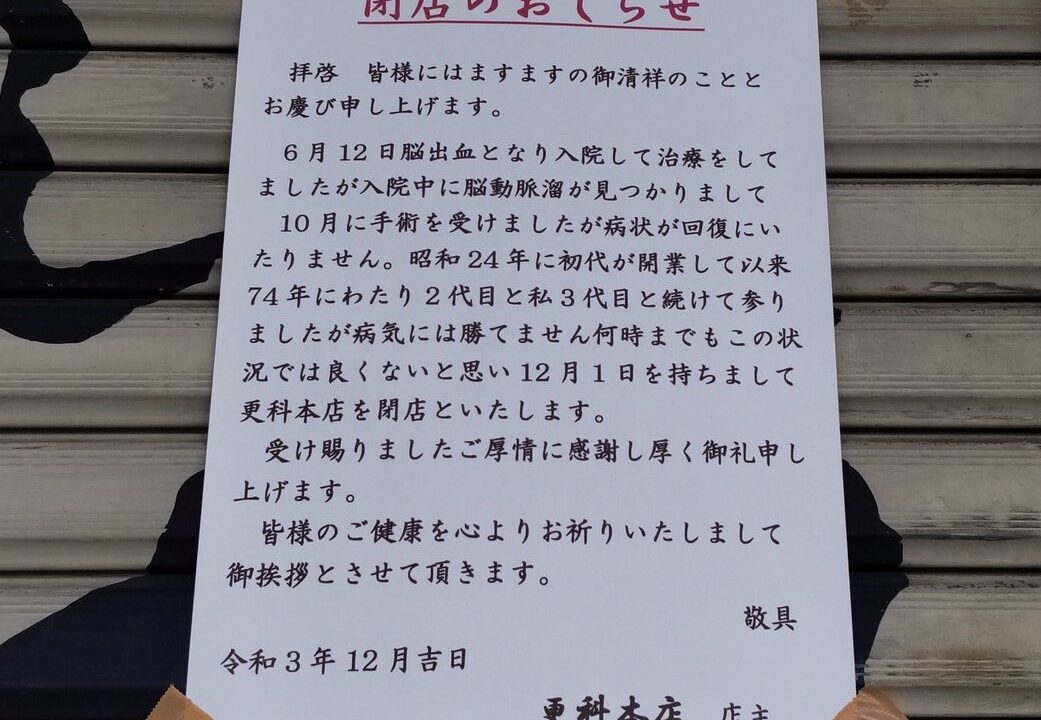 新瑞橋交差点にある、老舗の蕎麦・きしめんのお店『更科 本店』が2021年12月1日をもって営業を終了していました。