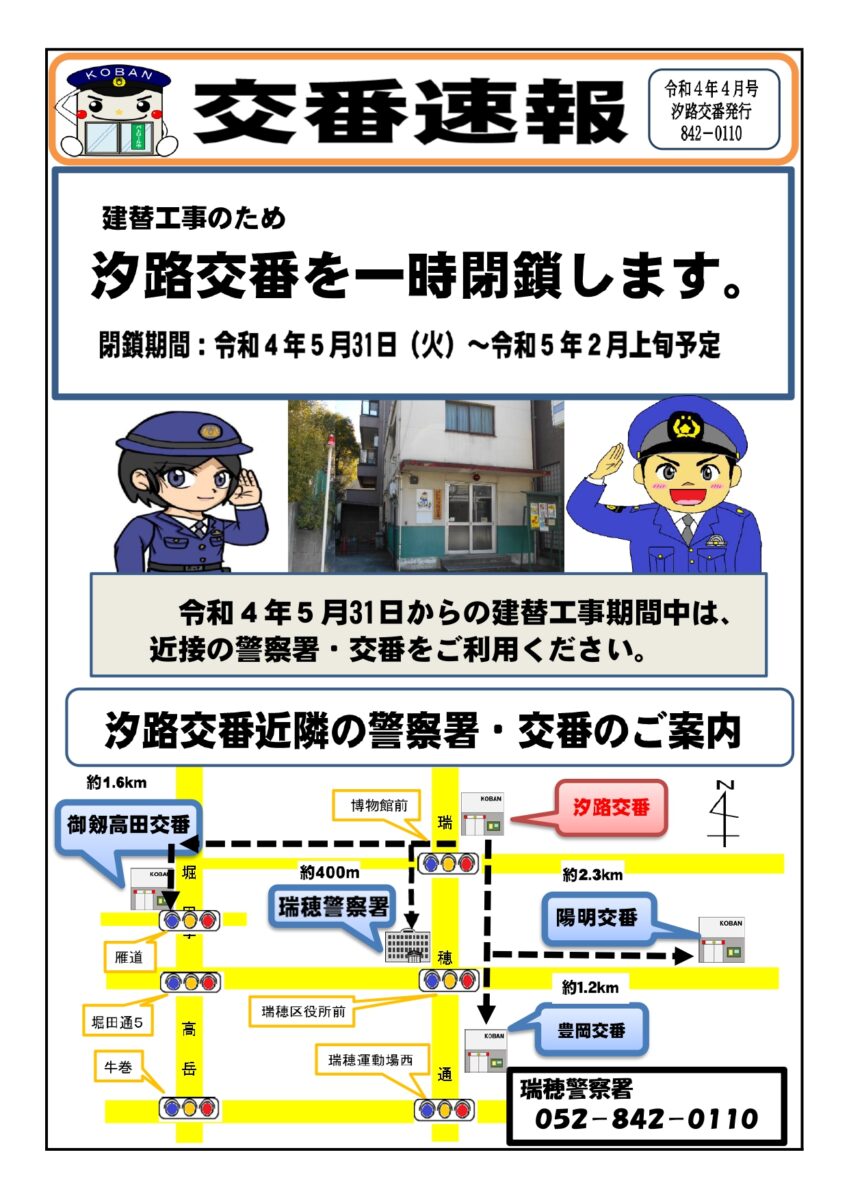名古屋市博物館の隣にある『汐路交番』が2022年5月31日(火)~2023年2月上旬(予定)まで、建て替え工事のため一時閉鎖となるようです。