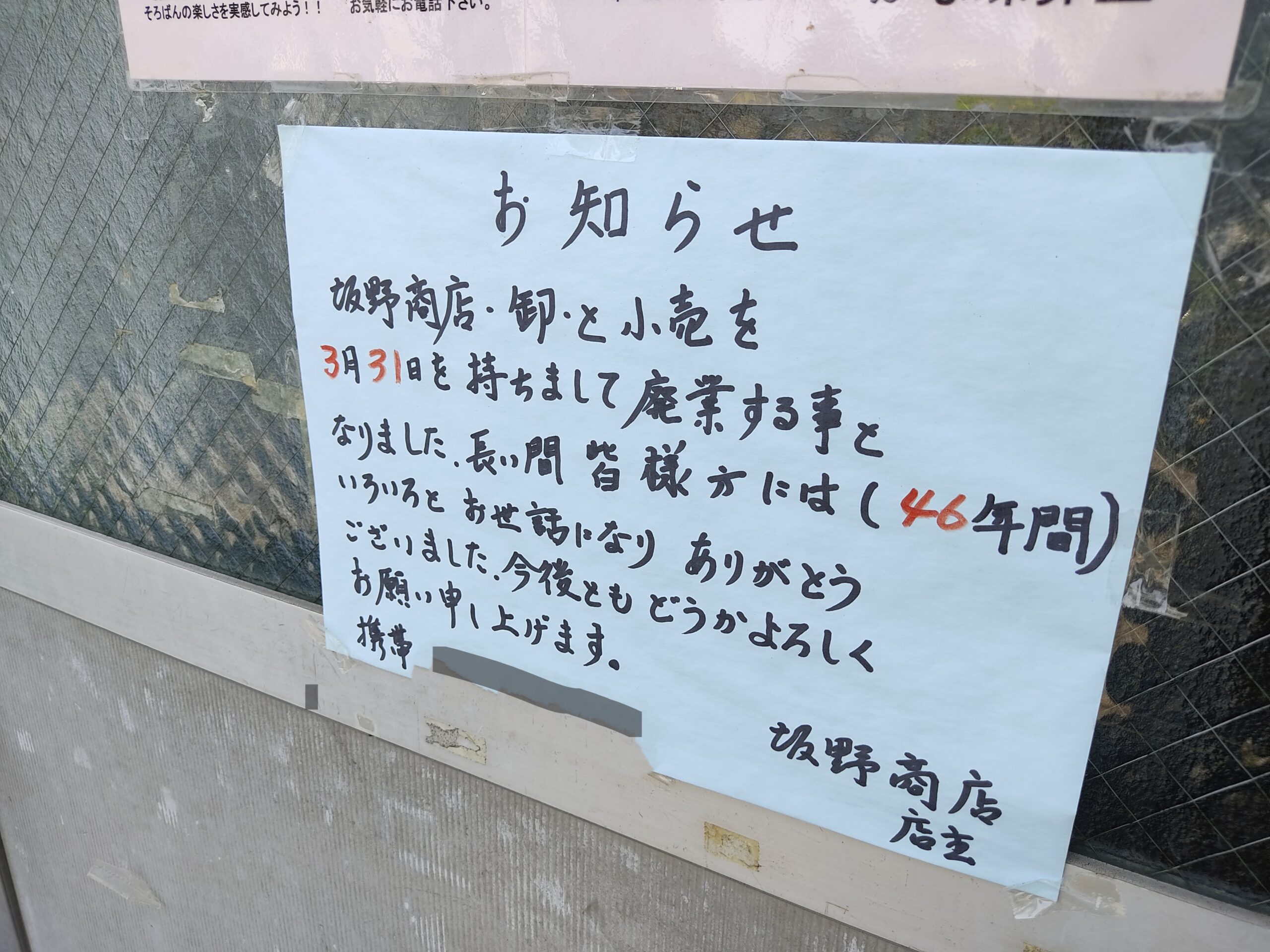 閉店のお知らせがお店の前に貼られていました。