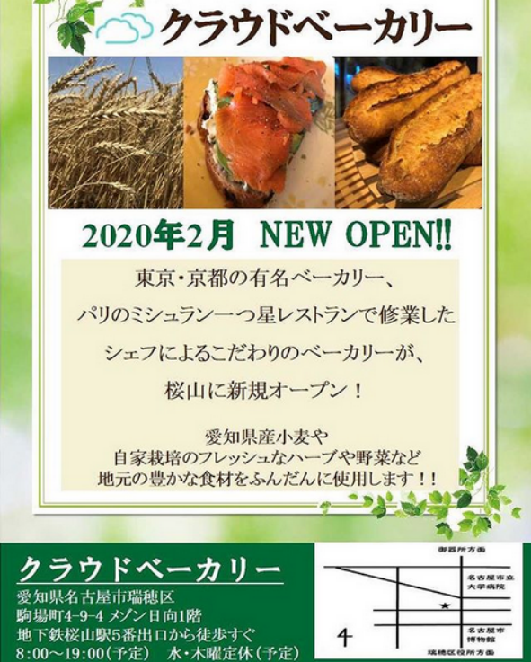 2020年2月に桜山の近くに新しいパン屋さん『クラウドベーカリー』がオープンします♪