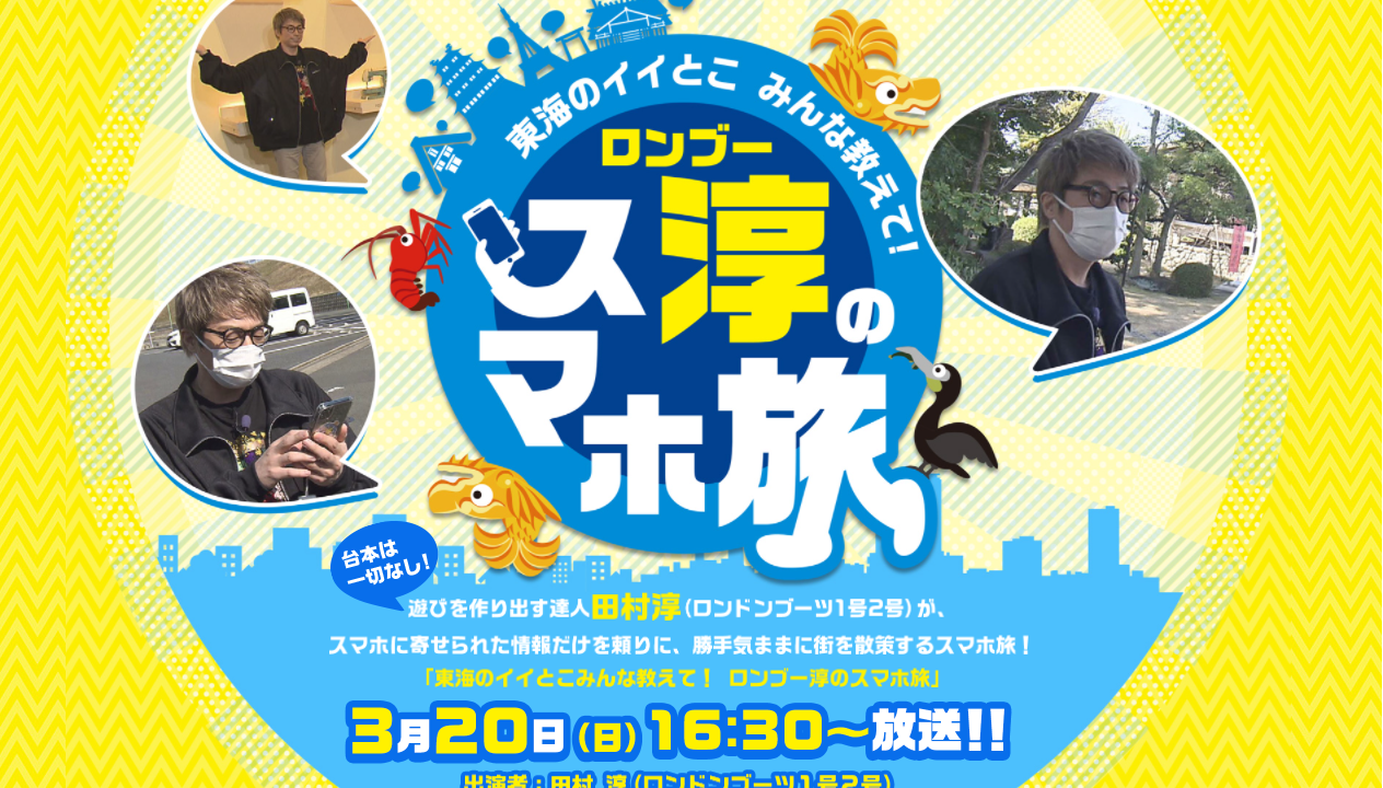 2022年3月20日(日)16:30~東海テレビで放送される『ロンブー淳のスマホ旅』に瑞穂区にいる、あの超有名人が登場します!!