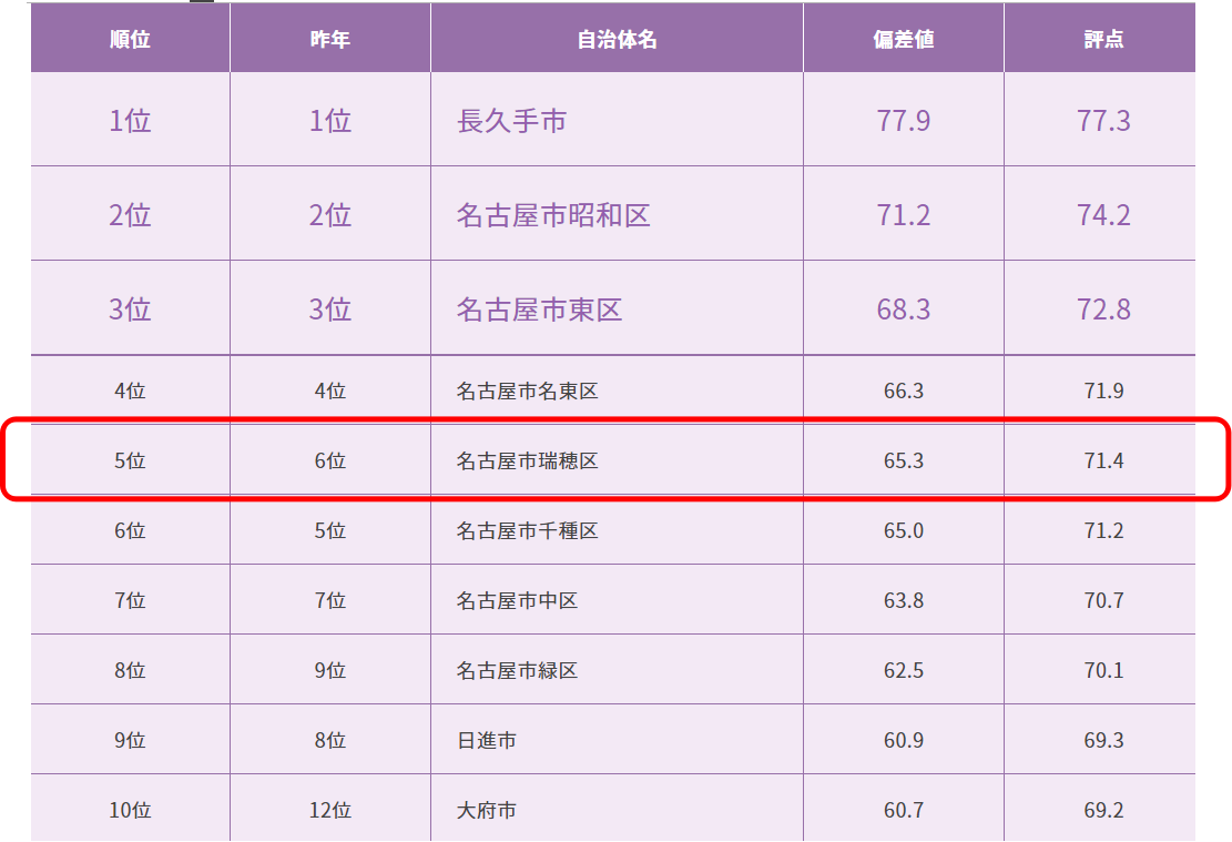 2021年の最新ランキング(愛知県版)が発表され、瑞穂区が見事!『第5位』に入りました!!!