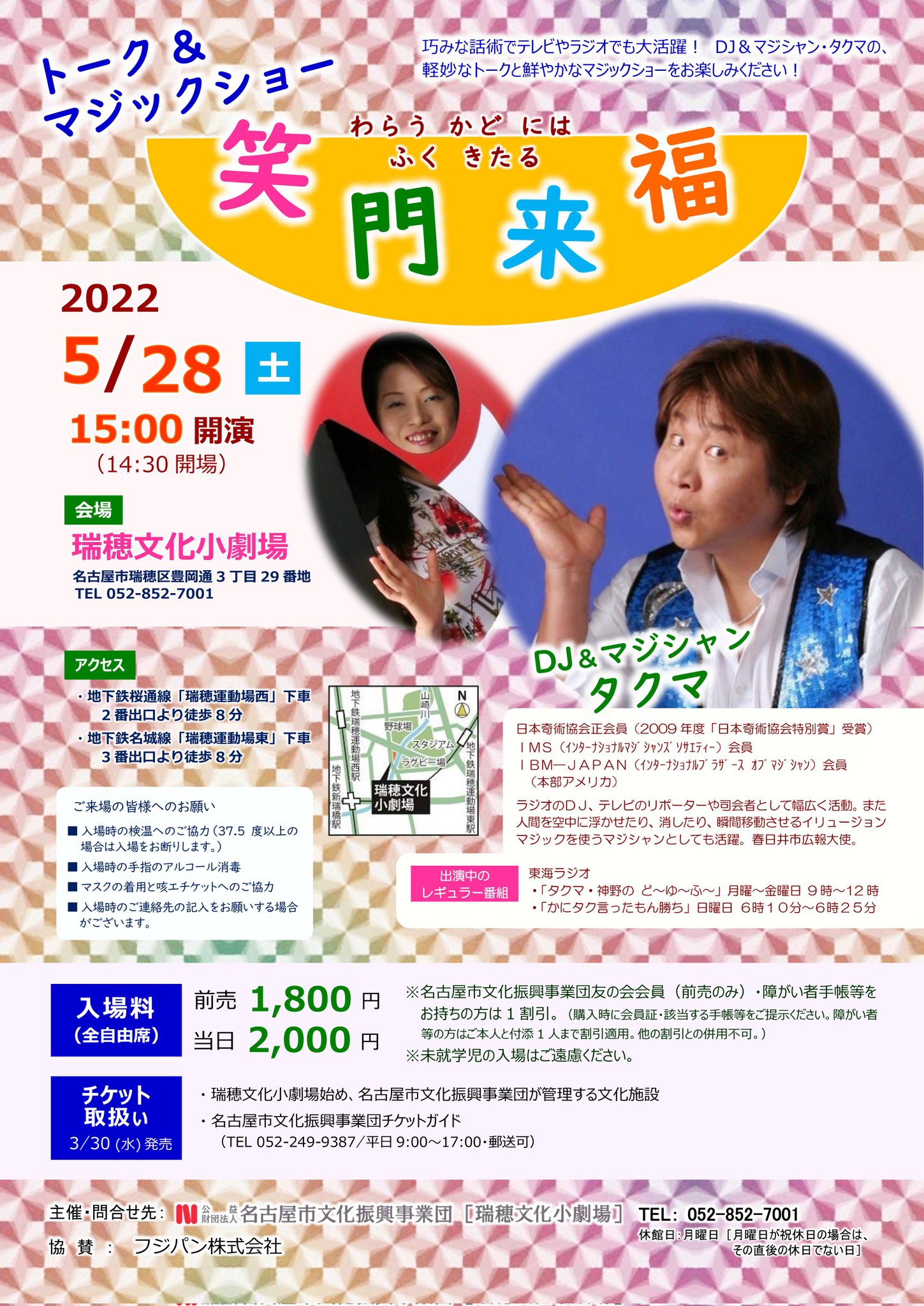 瑞穂文化小劇場『タクマトーク&マジックショー「笑門来門」』が5/28(土)にあるみたい【瑞穂区イベント】