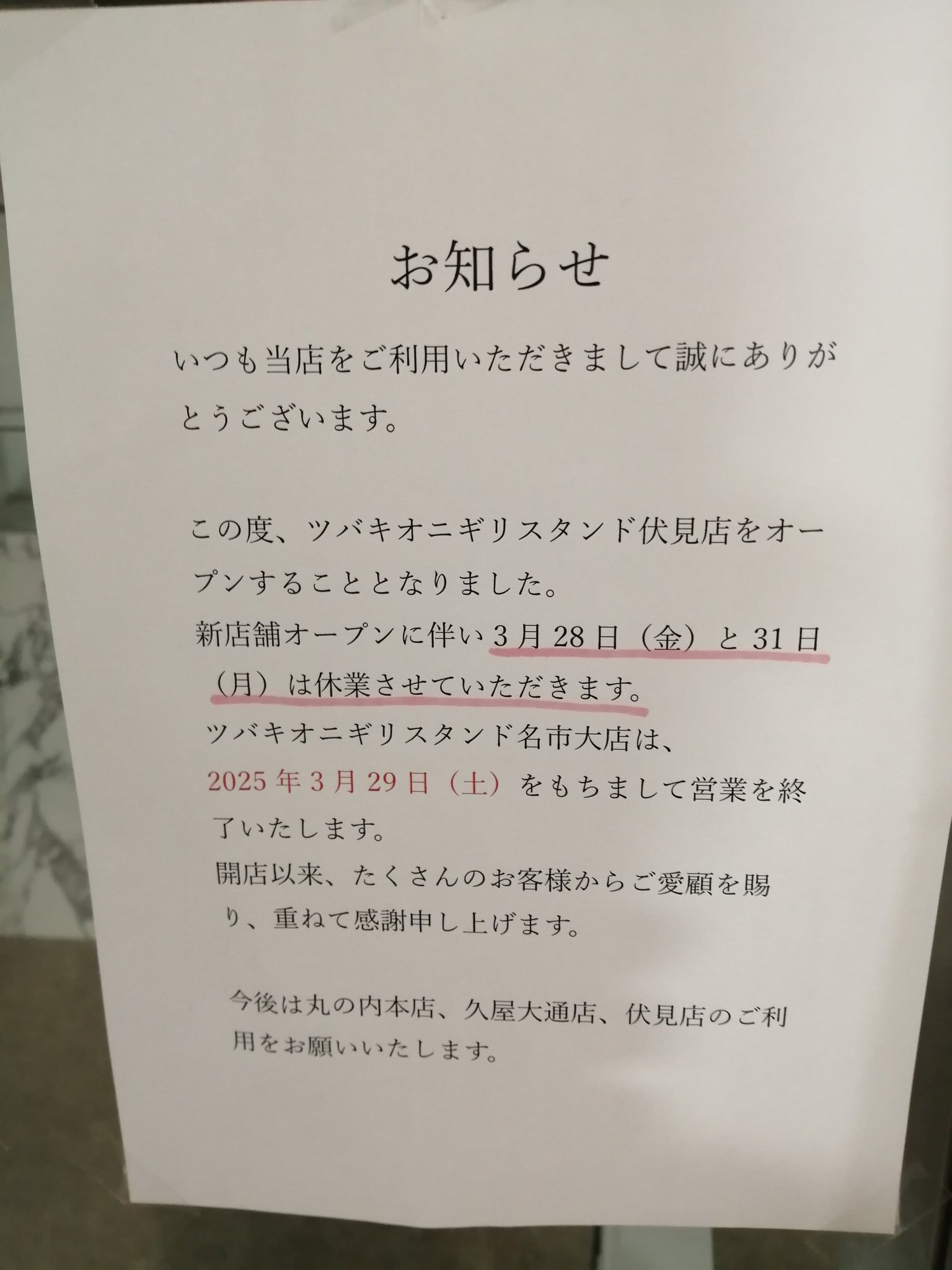 2025年3月29日(土)桜山・名市大病院内にあった、おにぎりのテイクアウト専門店『TSUBAKI オニギリスタンド』が営業を終了していました。