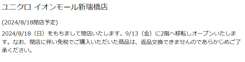 2024年8月18日(日)の営業を持って、イオンモール新瑞橋の『ユニクロ イオンモール新瑞橋店』が閉店。
