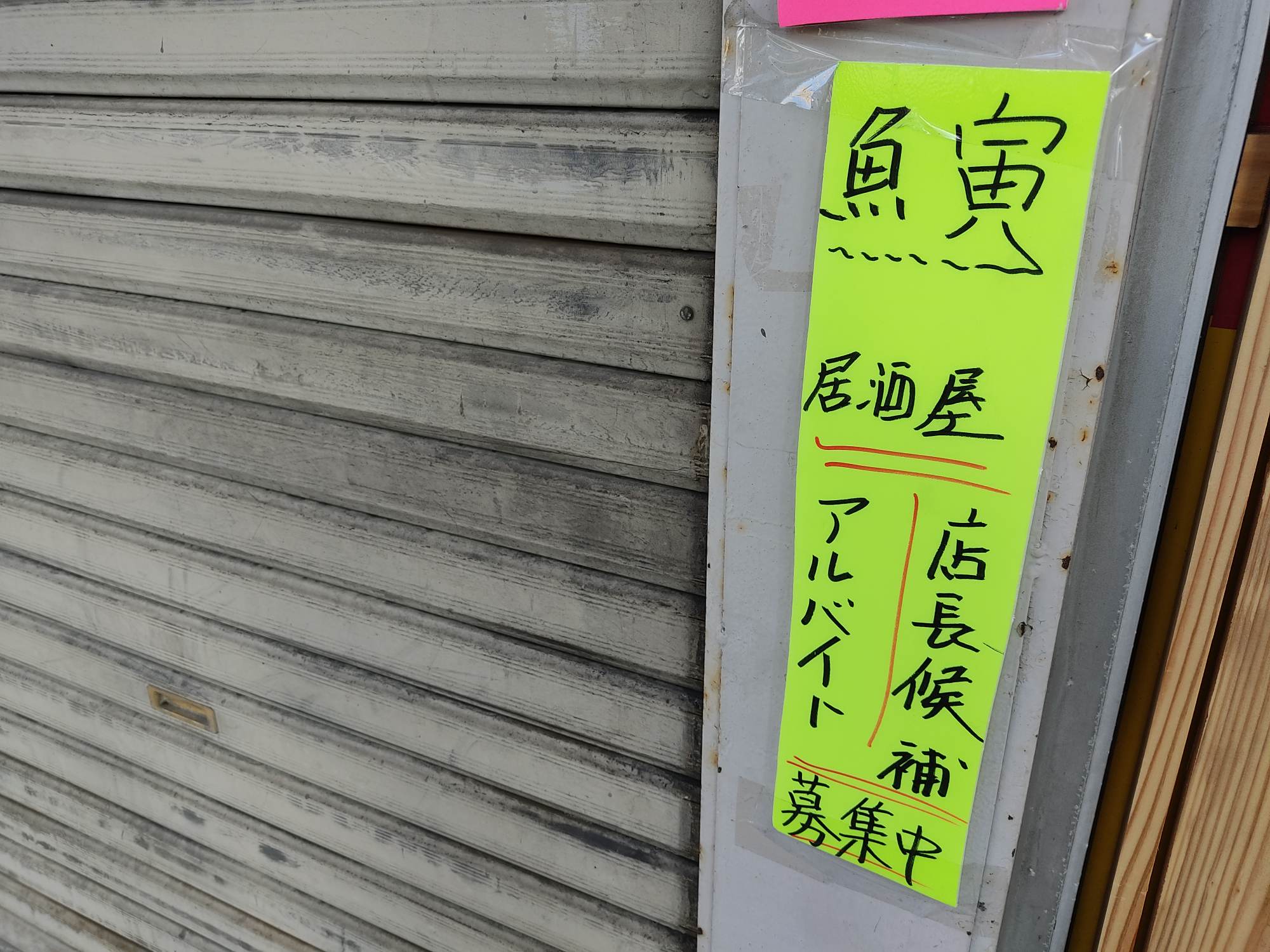 津賀田市場内にある魚屋さん『魚寅』の前に、居酒屋店長・アルバイト募集の紙が出ていました!!