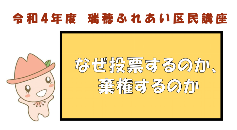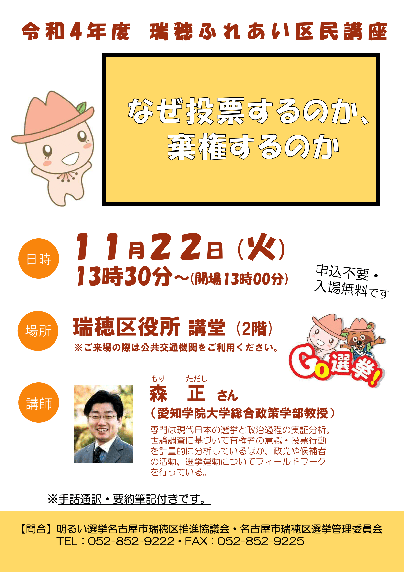 2022年11月22日(火)瑞穂区役所で瑞穂ふれあい区民講座『なぜ投票するのか、棄権するのか』が開催されます。