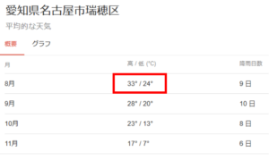 調べてみると、瑞穂区の8月の最高気温の平均で33℃