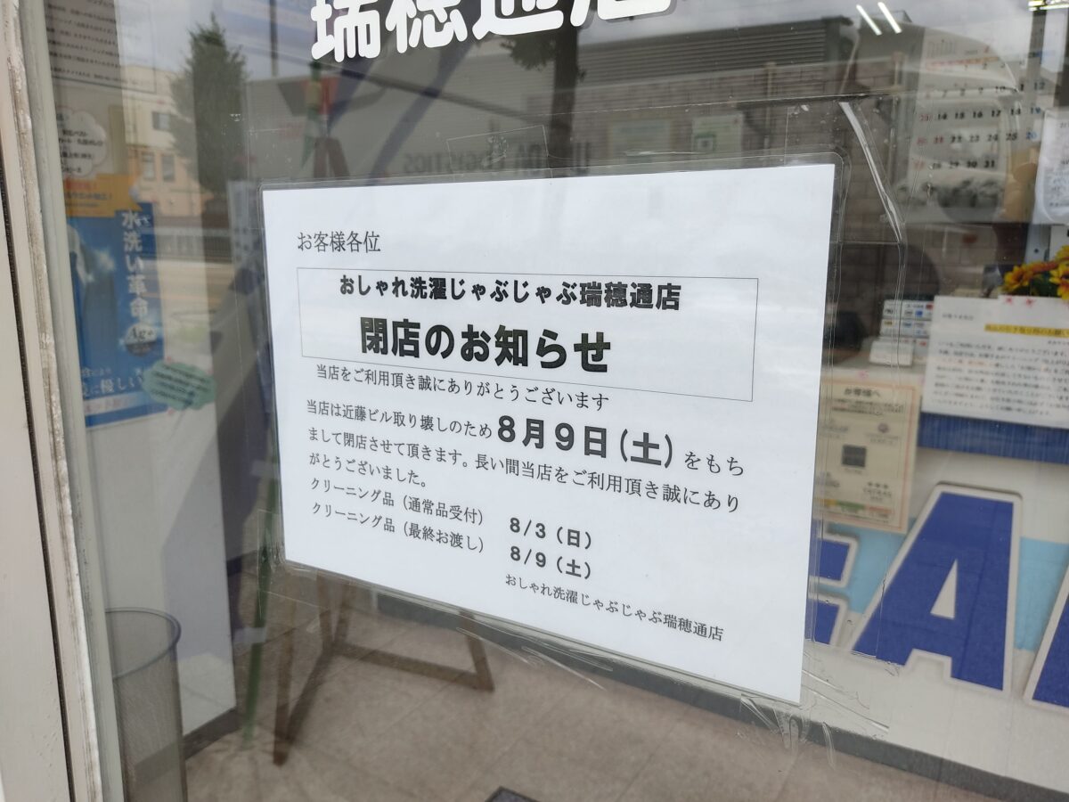 2025年8月9日(土)の営業をもって、瑞穂区役所近くで営業していた、『おしゃれ洗濯じゃぶじゃぶ瑞穂通店』が閉店のようです。